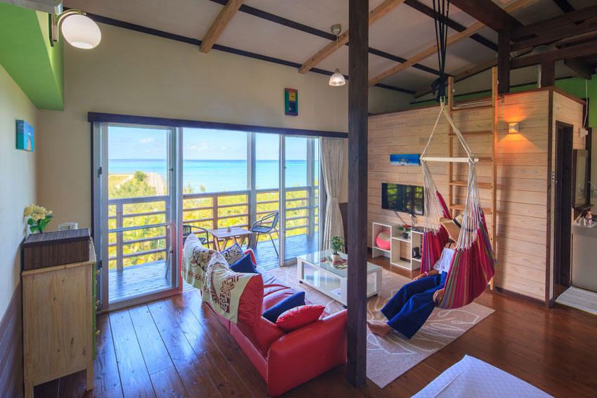 ハンモックチェアーに揺られて海を眺める時間はこの上なく贅沢。天気の良い夜は、きれいな月や星空を見ることもできます♪
