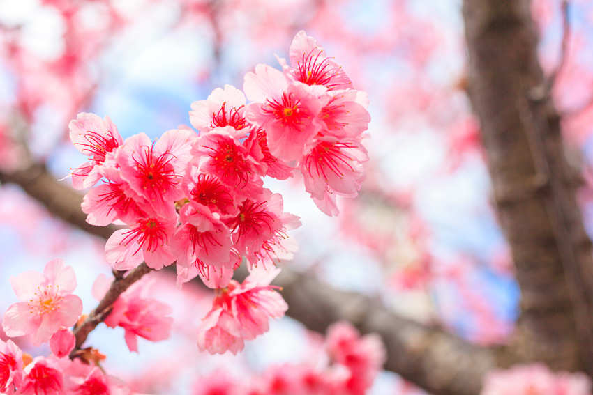 祭り期間中はちょど見頃の時期♪色鮮やかなピンクの寒緋桜(カンヒザクラ)が青い空をバックに満開になる姿をぜひ皆さんも生でご覧くださいね。