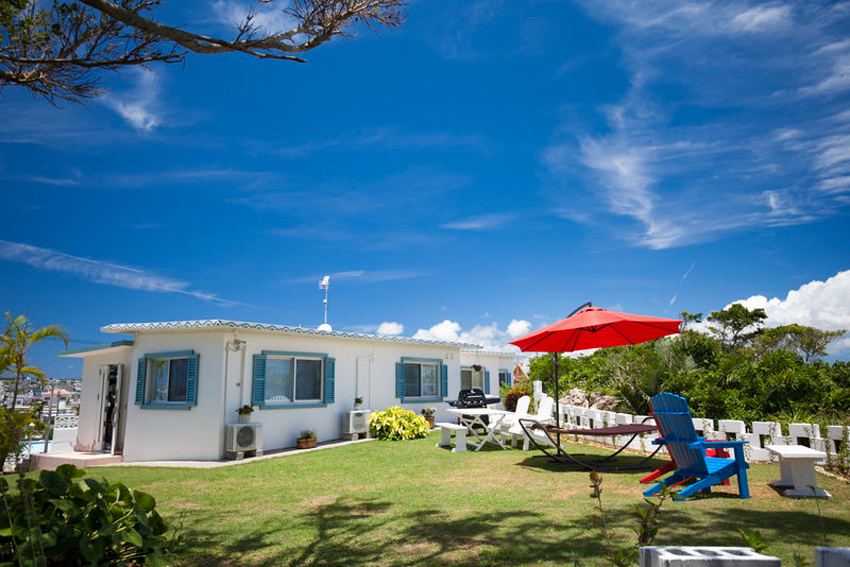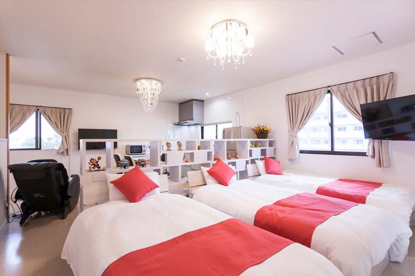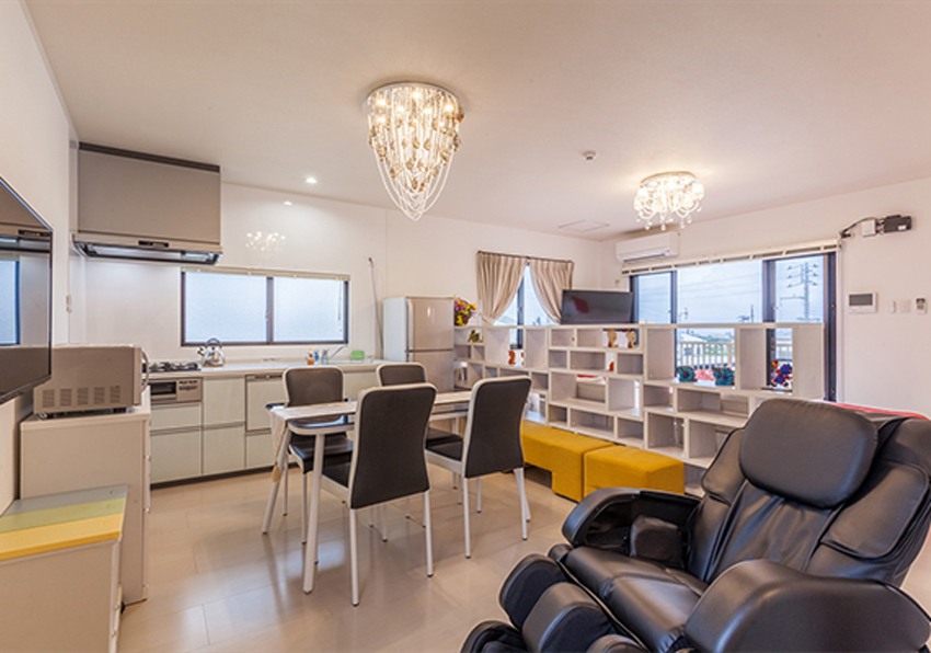 読谷村・残波岬(ざんぱみさき)の近く。11名まで宿泊可能な2階建ての新築コンドミニアム。