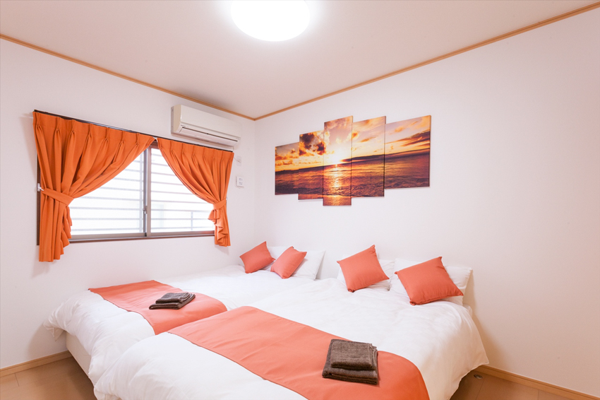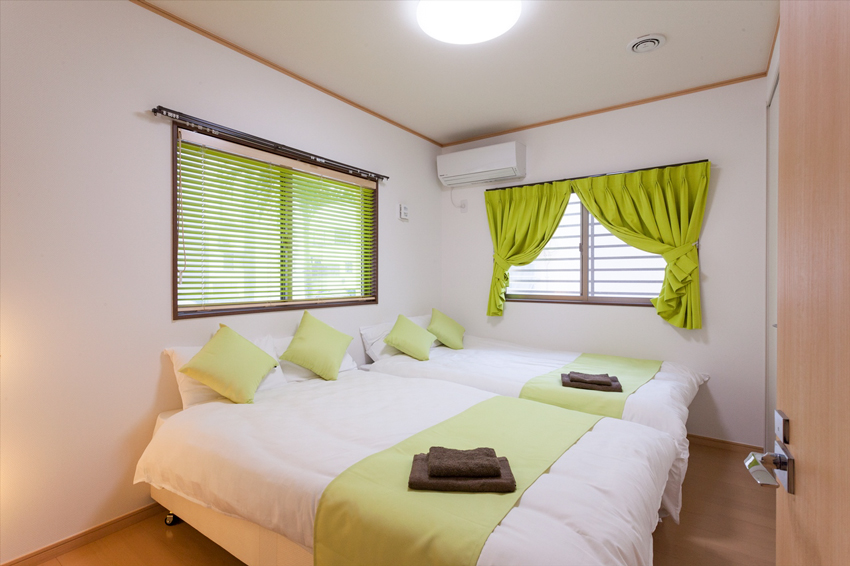 1階にあるベッドルームには、セミダブルのベッドが2つ設置され、緑を基調としたリラックスできる部屋とオレンジを基調とした暖かい雰囲気のお部屋があります。