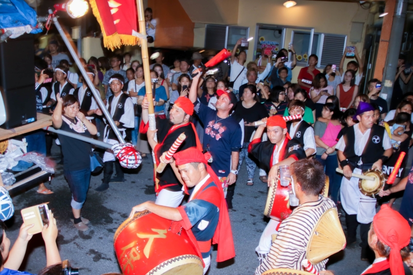 お盆期間中に各地域で先祖供養とお見送りのために青年会がエイサーや踊り等を演舞して練り歩く「道ジュネー」が行われます。