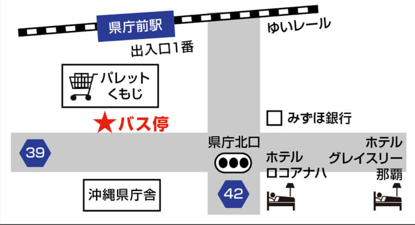 ゆいレール県庁前駅から徒歩約3分。国際通り入口にある「みずほ銀行 那覇支店」から徒歩約1分。