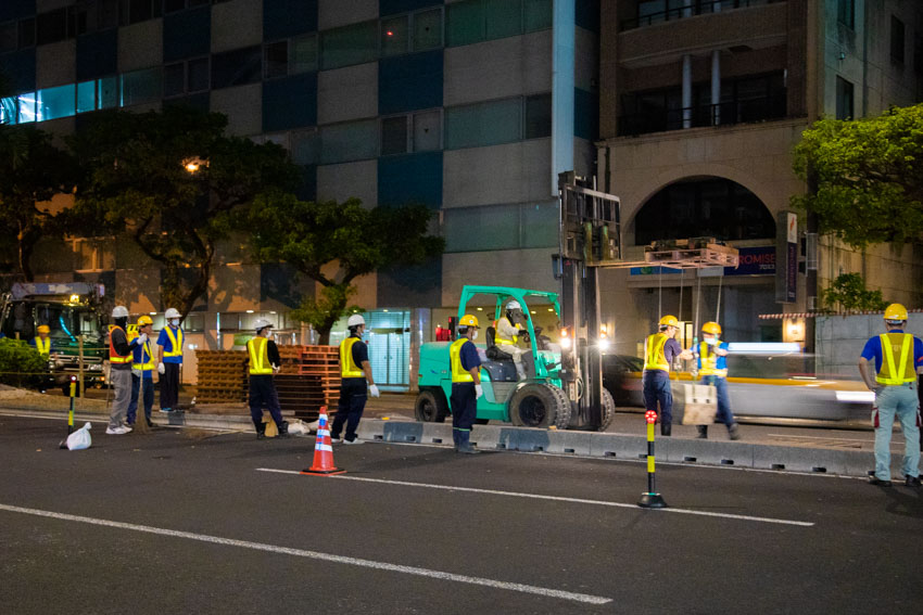 設置作業は綱挽の当日午前12時頃から58号線の中央分離帯の撤去から始まり、午前6時頃まで続きます!