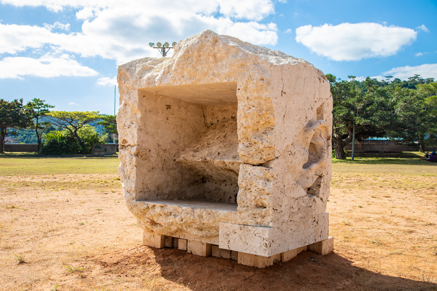 2019年に展示されていた彫刻でサンゴや貝などの死骸の堆積物からなる琉球石灰岩に人の形を刻むことで、人と自然が共存している様子を表現しています。こんな巨大な作品が展示されることも。