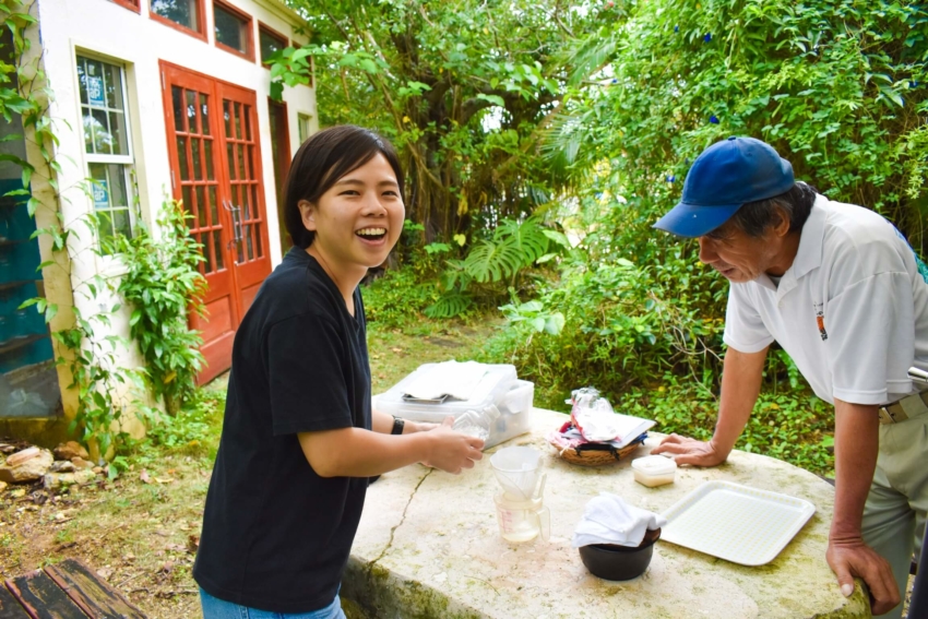採れたての海水は、砂や不純物を軽くコーヒーフィルターで取り除きます。職人さんと打ち解けてきました。笑