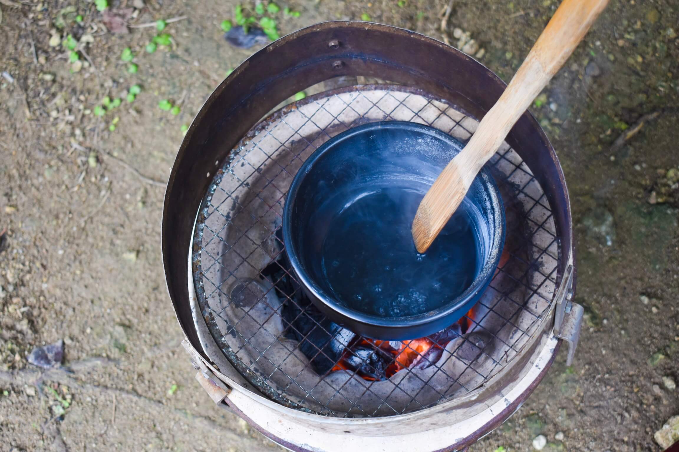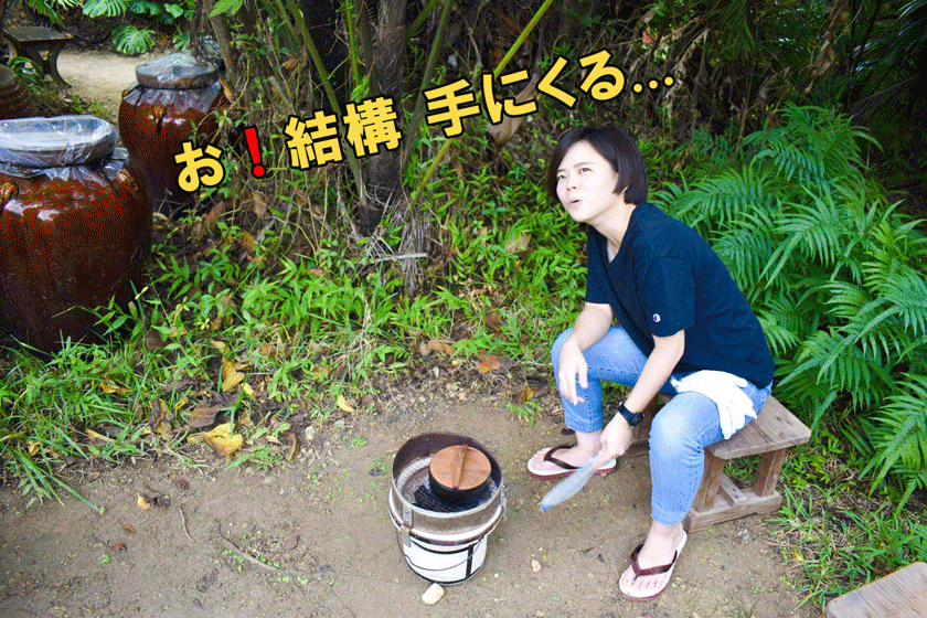 大きく火が上がった後は、器の周りに白いもの(塩)が見えてくるまで木べらで海水を回しつづけます!