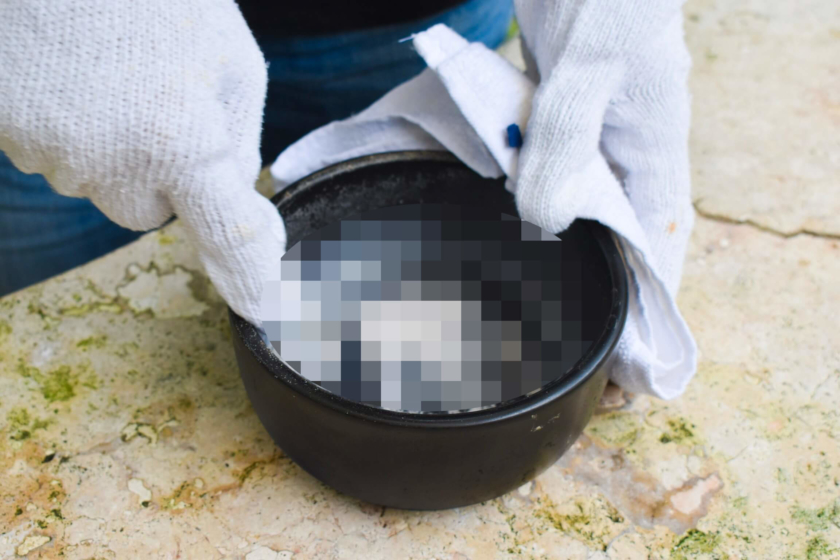 あとは、このできた塩をガリガリとスプーンで器から削り取る作業をしますが、早く削らないと余熱でせっかく作った塩が焦げてしまうそうです!