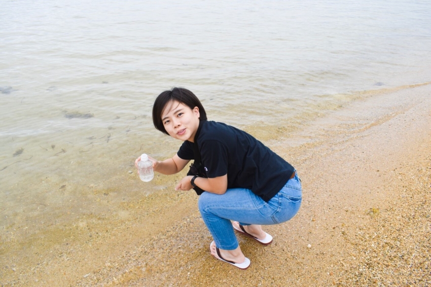 挨拶をすると、「ビーチサンダルに履き替えて、海水を採りにいきますよ~」と言われるがままにチェンジ!