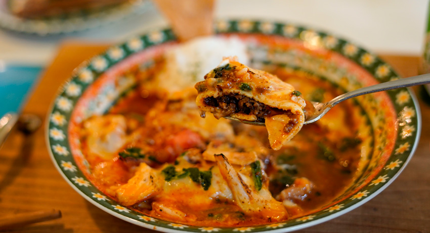 ビーフとビーンズが包まれたトルティーヤの上にチーズとトマトソースがかかったエンチラーダス。