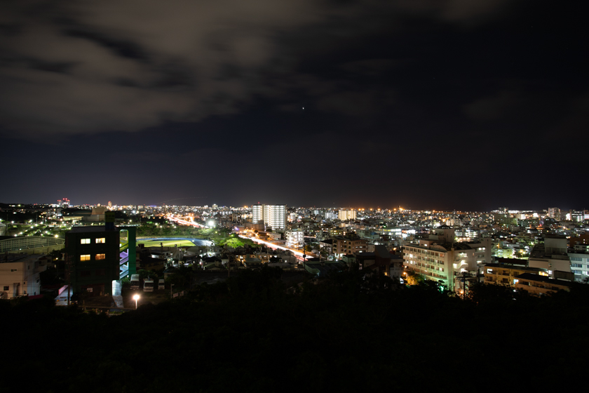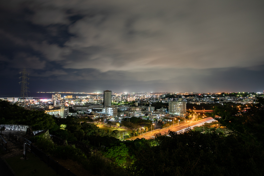 浦添大公園は浦添市と宜野湾市が隣接した場所にある公園で、遊具エリアが広く週末には子供連れで賑わい、国の重要史跡の「浦添城跡」があったりと沖縄県内でも大きな公園の一つです。ちょうど、展望台の下あたりに県道330号線伊佐トンネルがあり幹線道路を行き交う車も夜景の魅力の1つです。那覇市内から車で20〜30分で行くことができます。