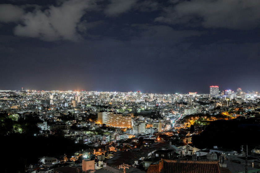 那覇市首里にある崎山公園は首里城公園からも近く海抜約120mの高台にある公園で、雨乞御嶽や御茶屋御殿石造獅子がある歴史スポットでもあるんです。夜景だけでなくサンセットも綺麗で、慶良間諸島に沈んでいく夕陽がこれまたなんとも言えない美しさ。地元の人からも人気のスポットで、公園内は街灯も明るく夜でも安心です。