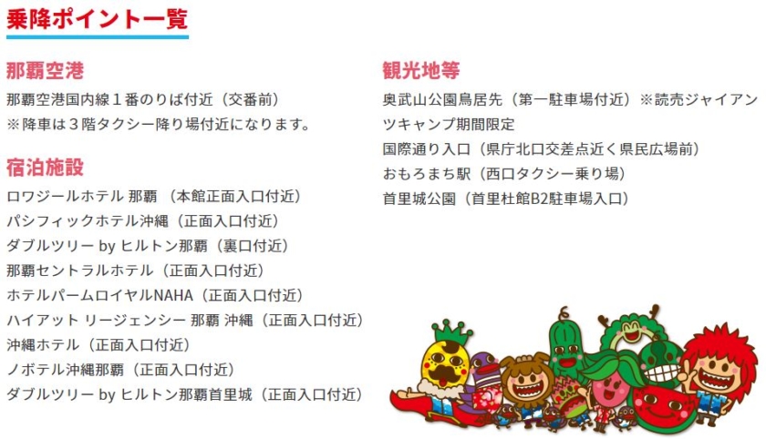 那覇空港と那覇市内のホテル9施設、観光地3施設から乗降可能