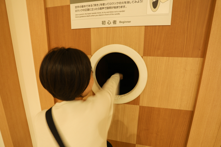 映像で浮き上がるロウソクの火を空手の突きで起こる風で消す体験、火消しに成功するとまるで空手家になったような気分を味わえます!