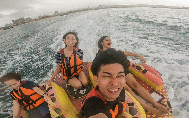 トーイングチューブの代表と言えばバナナボート、でもここではもう少しスリルを味わいたい人の為に、4種類のチューブから3つ体験したいチューブを選んで乗ることができます!