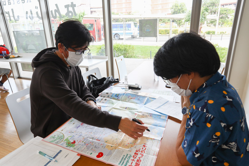 南城市にはどんな観光エリアがあるのかを相澤さんが教えてくれ、自分の好きな観光地を選んでNバスの時刻表を見ながら、周り方や乗り継ぎを一緒に考えました。