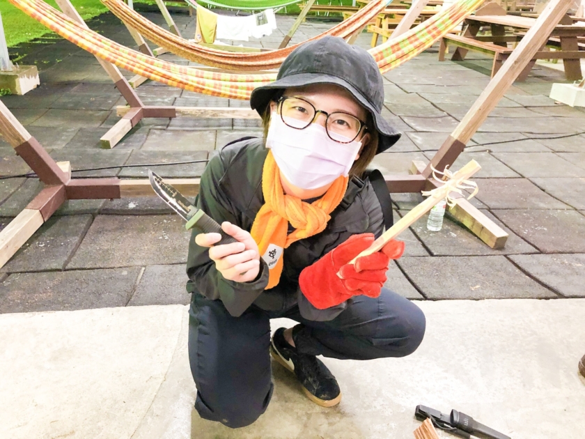 体験内容には、木材の先端を削って羽毛のようにするフェザースティック作りやファイヤースターターを使って火種を作るなど、焚き火の基礎基本を学ぶことができます!