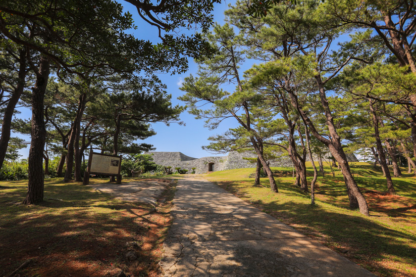 城跡へと進む道には琉球松が両脇に植えられており、