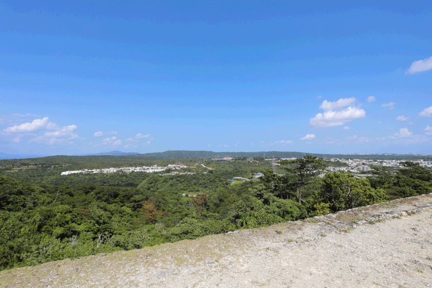 城壁の上から見える景色は、東側には森が広がり、西側には残波や恩納村方面の海を一望できます。