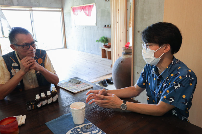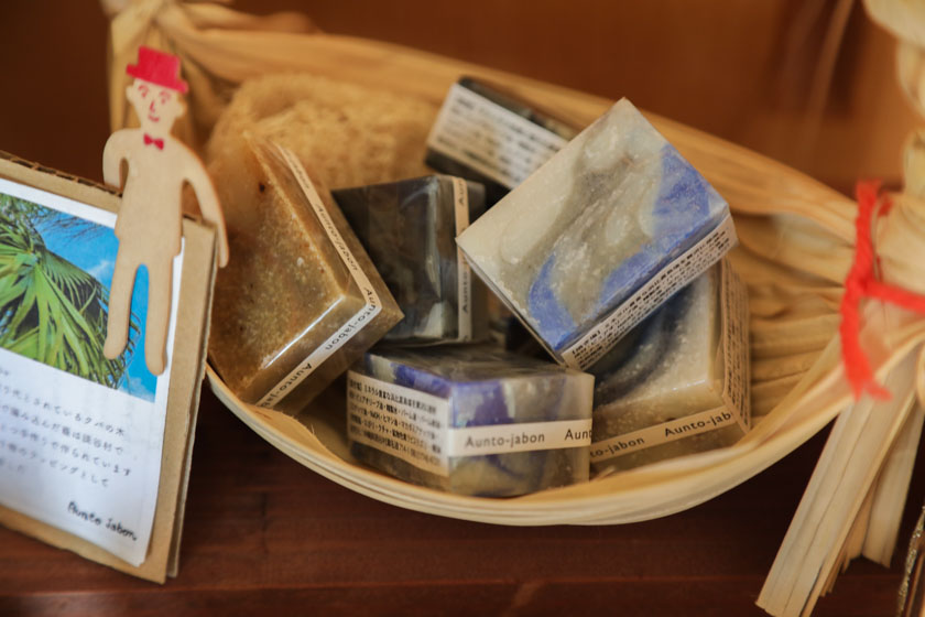 『Aunto jabon(アウントハボン)』では焼き塩を練り込んだり、麻炭、泡盛のもろみを練り込んだ、藤川さんのオリジナル石鹸も販売されています。