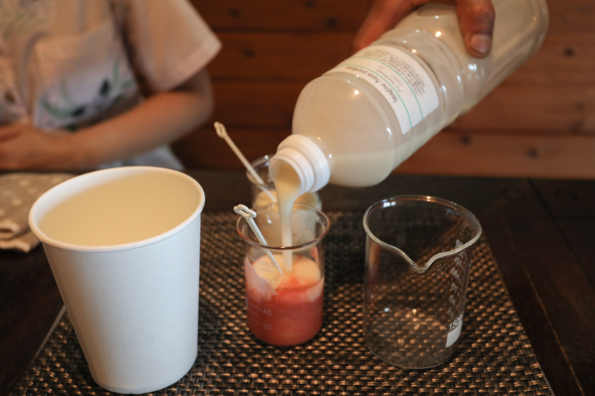 先ほどシェイクした石鹸を、最初に用意した着色料に注ぎ色をつけた石鹸と着色していない石鹸を用意します。