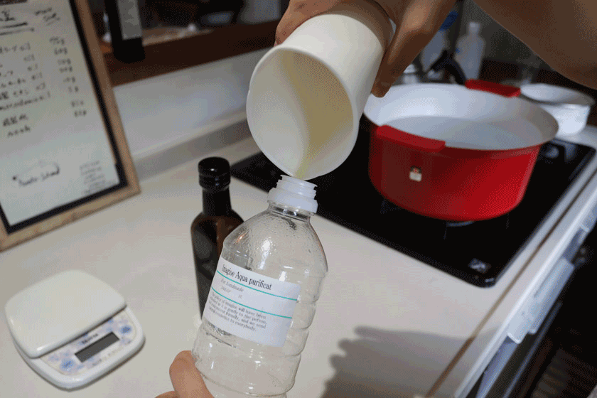 苛性ソーダ水は氷水で45度まで温度を下げて、オイルは湯煎で温度を上げていきます。