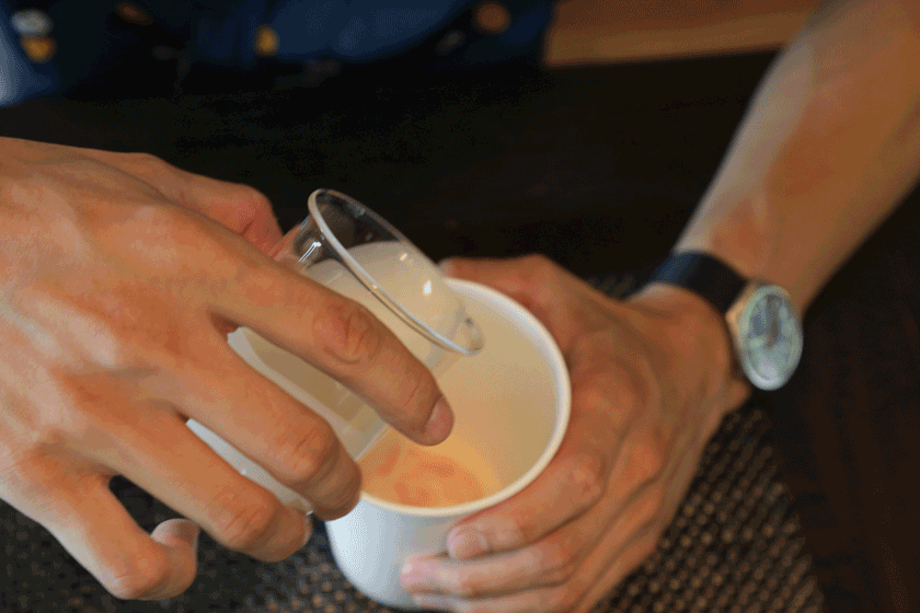 イニーは交互に少し勢いをつけて流し込みました。カフェのラテアートのように自分の好きな模様にすることも出来るし、勢いよく混ぜて切り出すまでどんな模様になるか楽しみにするもよし!スマイルマークを描いたりも出来ちゃう!当日の自分の気分で注ぎ方を悩んでみてね〜!