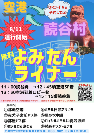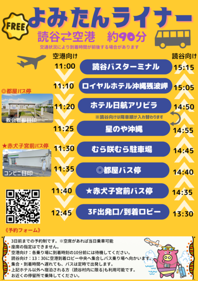 | 時間 | 空港向け 11時読谷バスターミナル出発 12時45分頃那覇空港到着 読谷向け 13時30分那覇空港到着ロビーへ集合 15時15分頃読谷バスターミナル到着 |