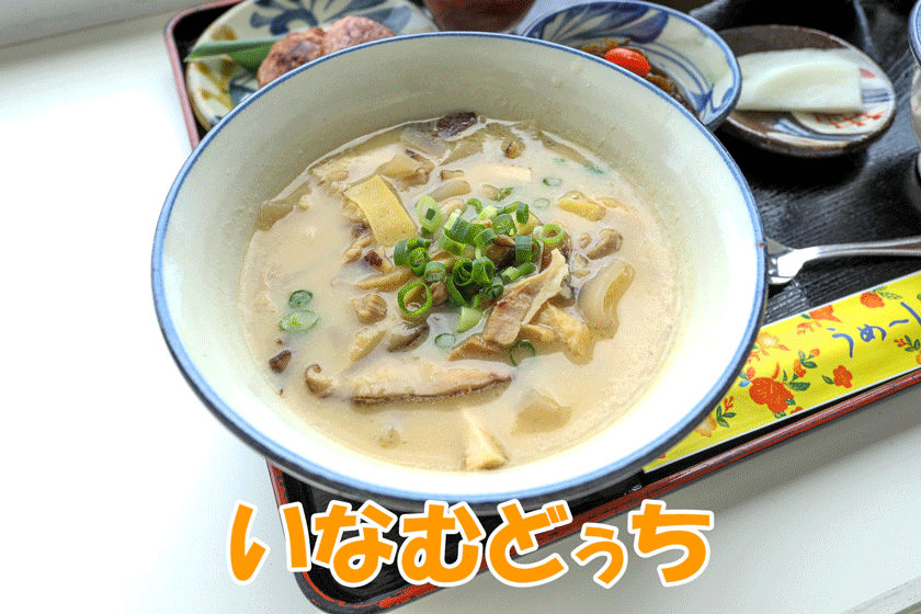 豚の三枚肉、こんにゃく、かまぼこ、しいたけ、油揚げなどを、白味噌で仕上げた汁物。