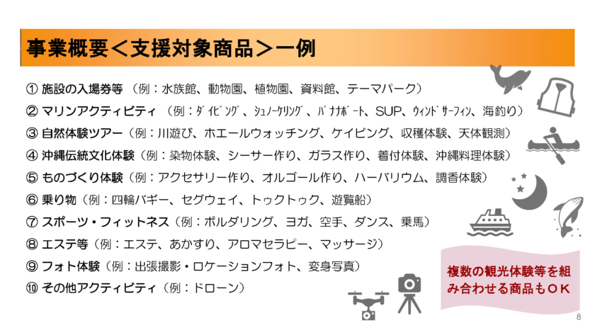 新型コロナウイルスの影響で打撃を受けている沖縄の観光体験事業者に対して、事業の下支えになるように、利用者に対してクーポンを配り観光需要を喚起して支援を行うもの。