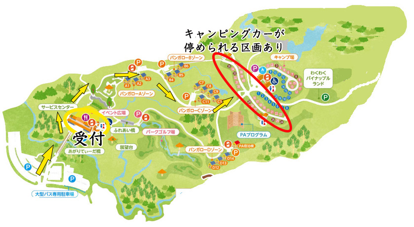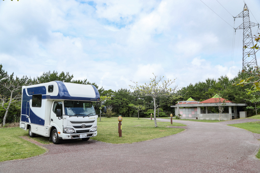 キャンピングカー専用の区画があり、木の枝が当たらないようにスペースがとられています。トイレと炊事場も近くにあるので安心です。