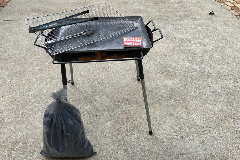 セット内容は鉄板、金網、トング、炭トング、着火剤、木炭の6点セット