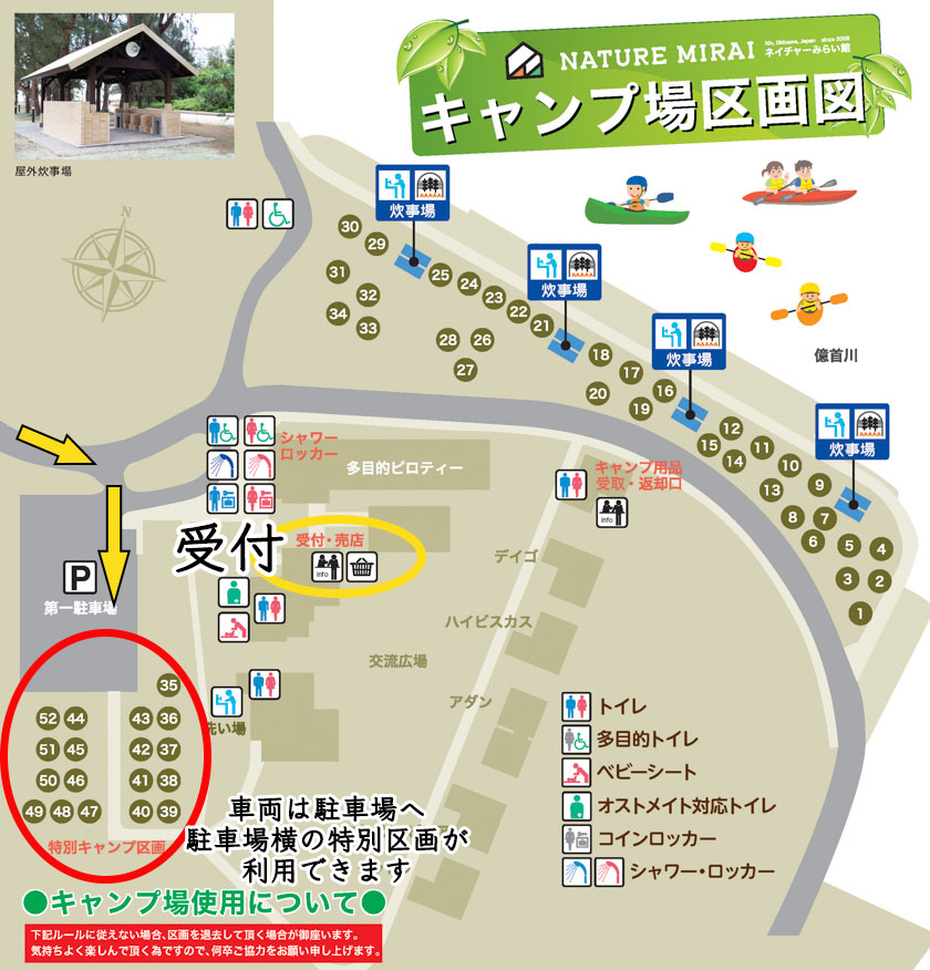 キャンピングカー利用の場合は第一駐車場に停めて、特別キャンプ区画でBBQなどをすることができます!洗い場も近くにありますよ。