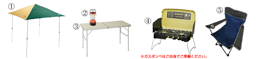①タープ②ランタン③テーブル④ガスコンロ⑤チェア(4脚)の5点セットで特にテーブルや椅子がついてるのは便利です!