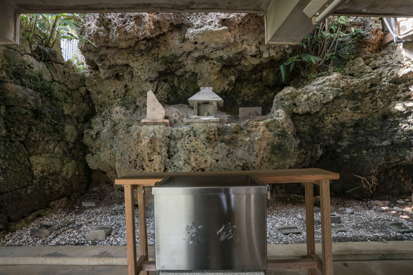 そして、地下2階に泊ユイヤギ御嶽があります。少しひんやりした空気と物静かな雰囲気が漂う空間です。御嶽は沖縄の信仰の中心になる存在でもあり、神を祀る聖地で神社に相当する場所です。天久宮を参拝しに来た際は泊ユイヤギ御嶽も忘れず参拝してくださいね。