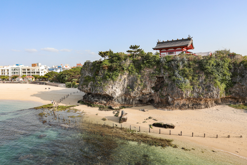 琉球八社の中で一番海に近く、那覇市唯一のビーチ「波の上ビーチ」のそばにあります。珊瑚が隆起して出来た断崖の上に鎮座している姿は独特で、波の上大橋から見るとよく分かりますよ。波の上ビーチは「開運ビーチ」とも言われ参拝後に訪れるのもGood!!運気をさらに上げていきましょう♪