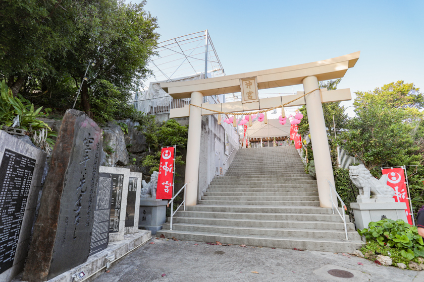 頂上には天燈山御嶽(てんとうざんうたき)という場所になります。天受久女龍宮王御神(天照大御神)が鎮まる神地とされているんですよ。沖宮に参拝した際は天燈山御嶽まで参拝して行ってくださいね!沖宮の中で一番高い場所にあり眺望もいいんですよ〜