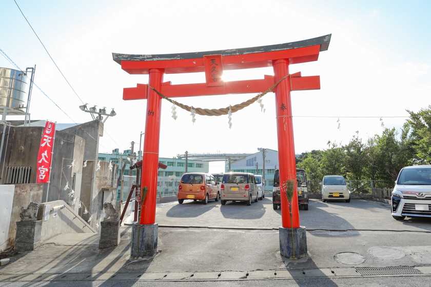 天久宮は那覇市泊に鎮座しており、とまりんや泊漁港からも近く隣には高校があります。こちらの天久宮は珍しい構造で、写真でわかるように一ノ鳥居の先は駐車場でここが境内の一番上なんです。脇の階段を降りると社務所や本殿が、その地下に御嶽がある三層構造になっているんですよ。鳥居が敷地の一番高い場所に建てられているのは珍しいですよね。
