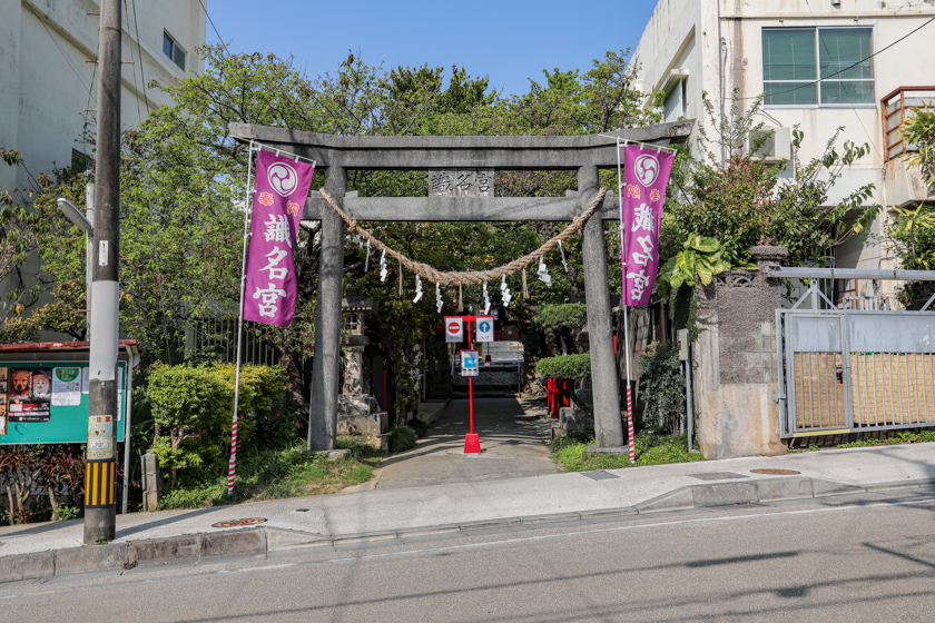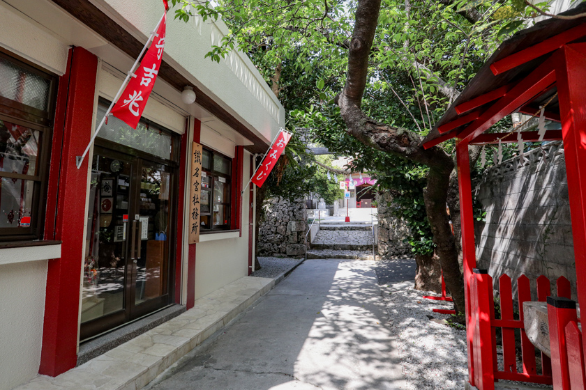 繁多川の住宅街がある坂道途中に鎮座していて、道沿に一ノ鳥居が立っています。琉球八社の中で一番首里城に近い神社で約1km程しか離れておらず、首里城と識名宮の間には首里の金城町石畳道があります。識名園も約800m程の距離ですよ。