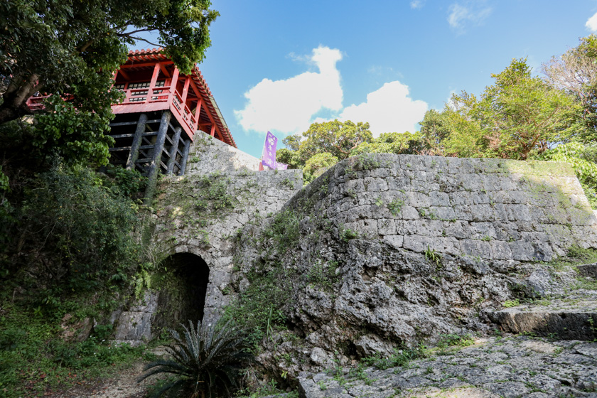 拝殿前に着くと沖縄の城址に見られるような石積みが見られますね、石のアーチ門があり石段が拝殿へと続きます独特な造りをしています。拝殿は懸造(かけづくり)という長い柱で固定してその上に建物を建てる造りで、有名な建物だと清水寺がこの造りです。沖縄では末吉宮でしか見られないんじゃないでしょうか。