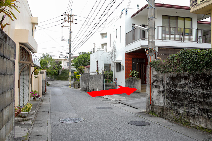 識名宮の駐車場は神社の横にありますが少し分かりにくくなっています。通り沿いにある食堂ざっくばらん横の路地に入ります。繁多川から上がって来た方はサンエー繁多川店前の信号を超えて最初の路地に左折、識名園側から下って来た方は識名宮を超えて直ぐの路地に右折すると覚えてください