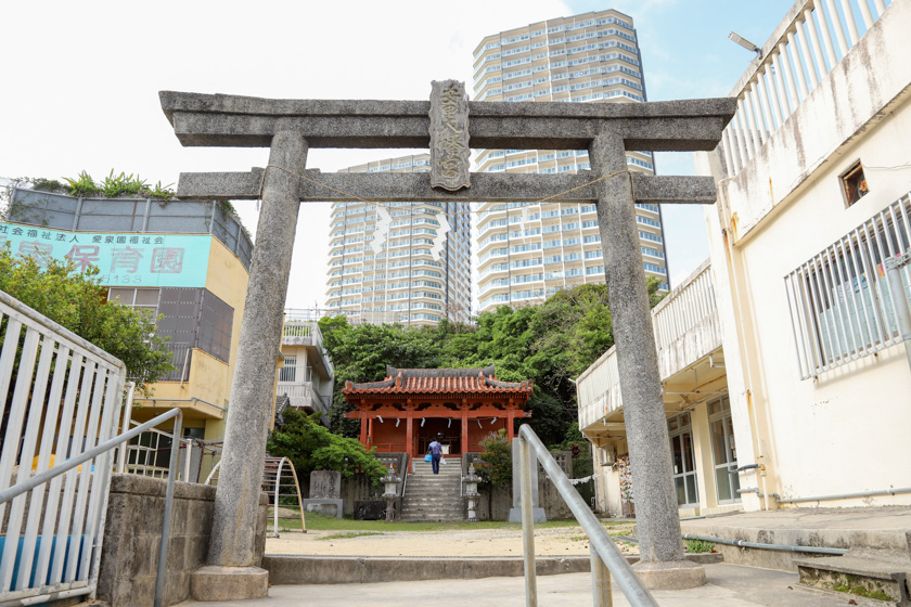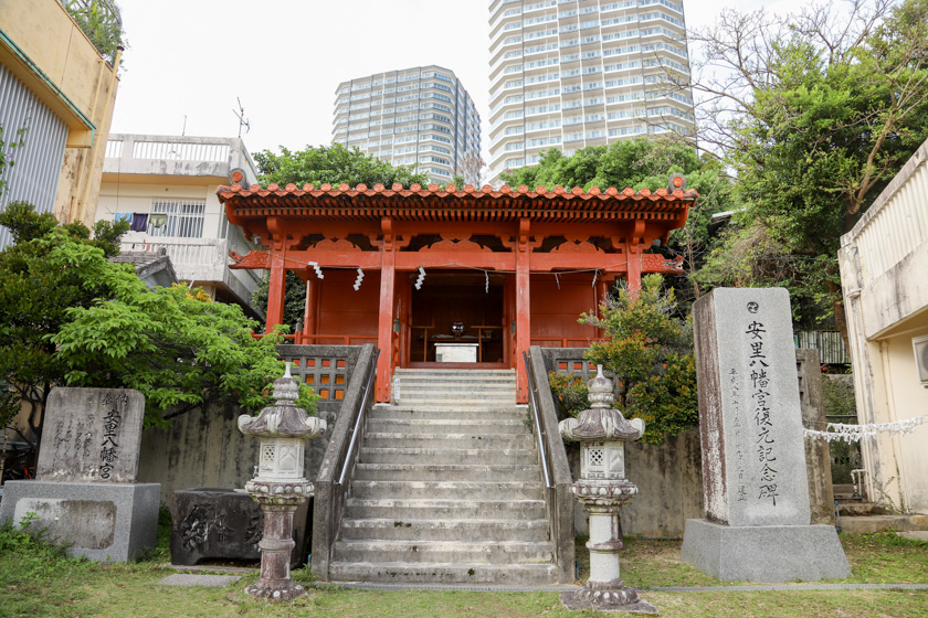 琉球八社の中で唯一「八幡様」を祀っている神社で、一番国際通りから近い神社です。住宅街の少し中に入った場所に鎮座しています。後ろにはおもろまちに建つタワーマンションがあり、少し不思議な感覚に。保育園が隣接していて時間帯によっては境内で子供達が遊んでいる事も。