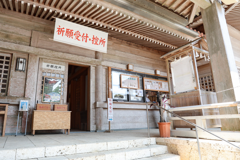 拝殿の左側に授与所・祈願受付があります。御守やお札などは、こちらで拝受できますよ。