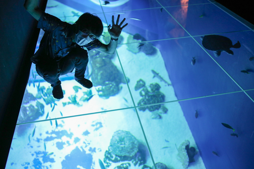 水槽の真上を歩けるガラス張りのエリアは下からは見えないガラスで、魚やウミガメが逃げる事なく真下を優雅に泳いで行くので面白いですよ〜ガラスの上は怖いという方もガラス張りじゃない通路もあるので、覗き込んでみるのもいいかも!