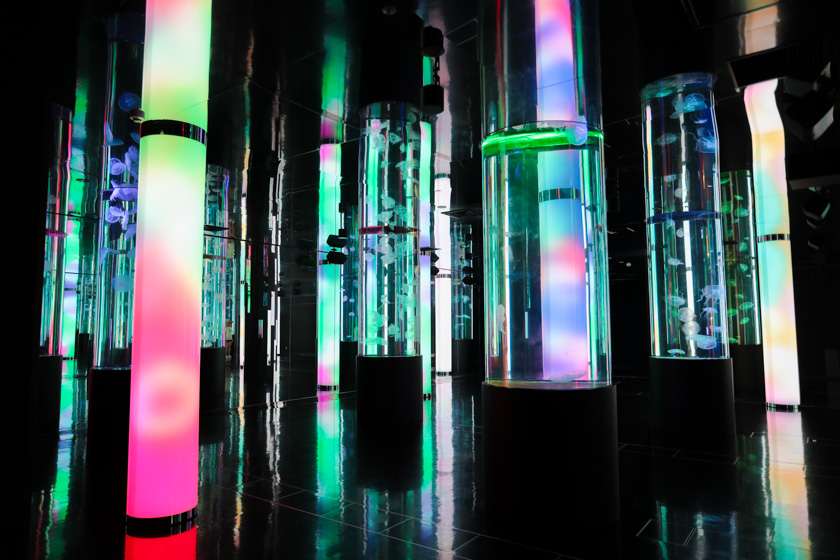 こっちもオススメで、ライトアップされた柱が立つエリアはクラゲの水槽があるエリア。ふわふわと水槽を浮遊するクラゲが癒しで、ライティングも変化していくので室内の雰囲気が変化していく感じもまた、楽しい。