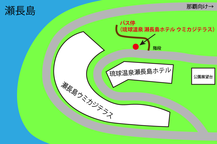 バス停は琉球温泉瀬長島ホテル正面入り口目の前にあり、到着・出発両方とも同じバス停になります。降りた場所を覚えておけば乗車時も安心です。