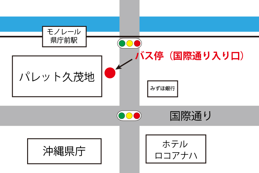 国際通り入り口バス停は、パレット久茂地のモノレール駅寄りにあります。東京バスと書かれたバス停の標識が立っているのでわかりやすいと思います。