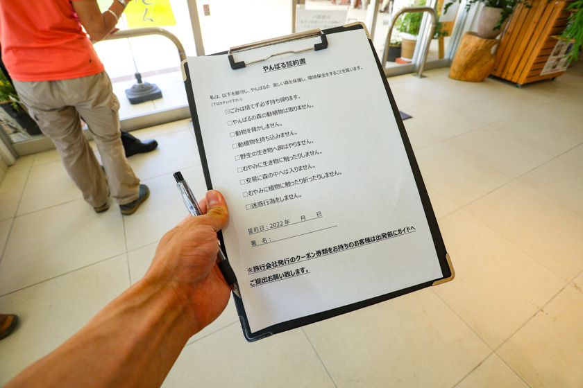 やんばるの森に入り学ぶにあたって、誓約書にチェックをつけて署名をします。