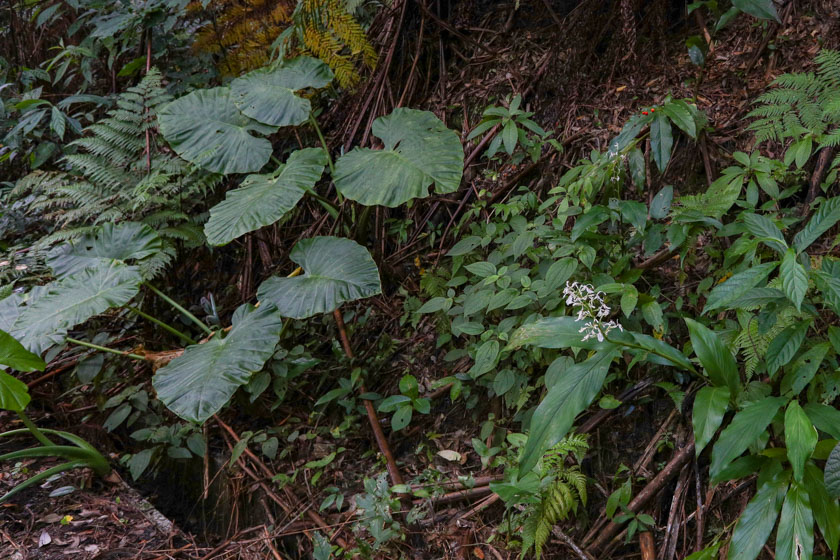 写真左の大きな葉っぱは、某アニメ映画で葉っぱの傘のモデルになった植物「クワズイモ」です。