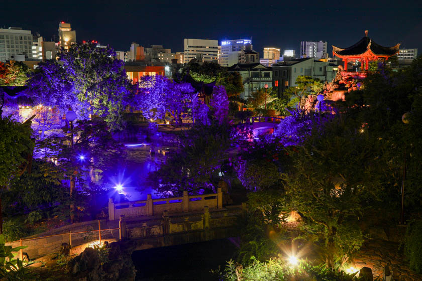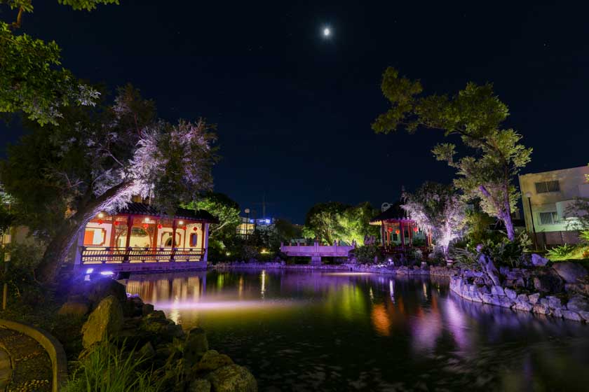 那覇のオフィスビルが佇む中にライトアップで浮き上がる中国式の庭園。