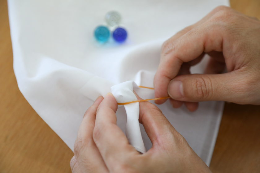 ビー玉を入れて結べば、ビー玉部分が円形に染まって、輪ゴムの部分が白い輪っかになるイメージ♪